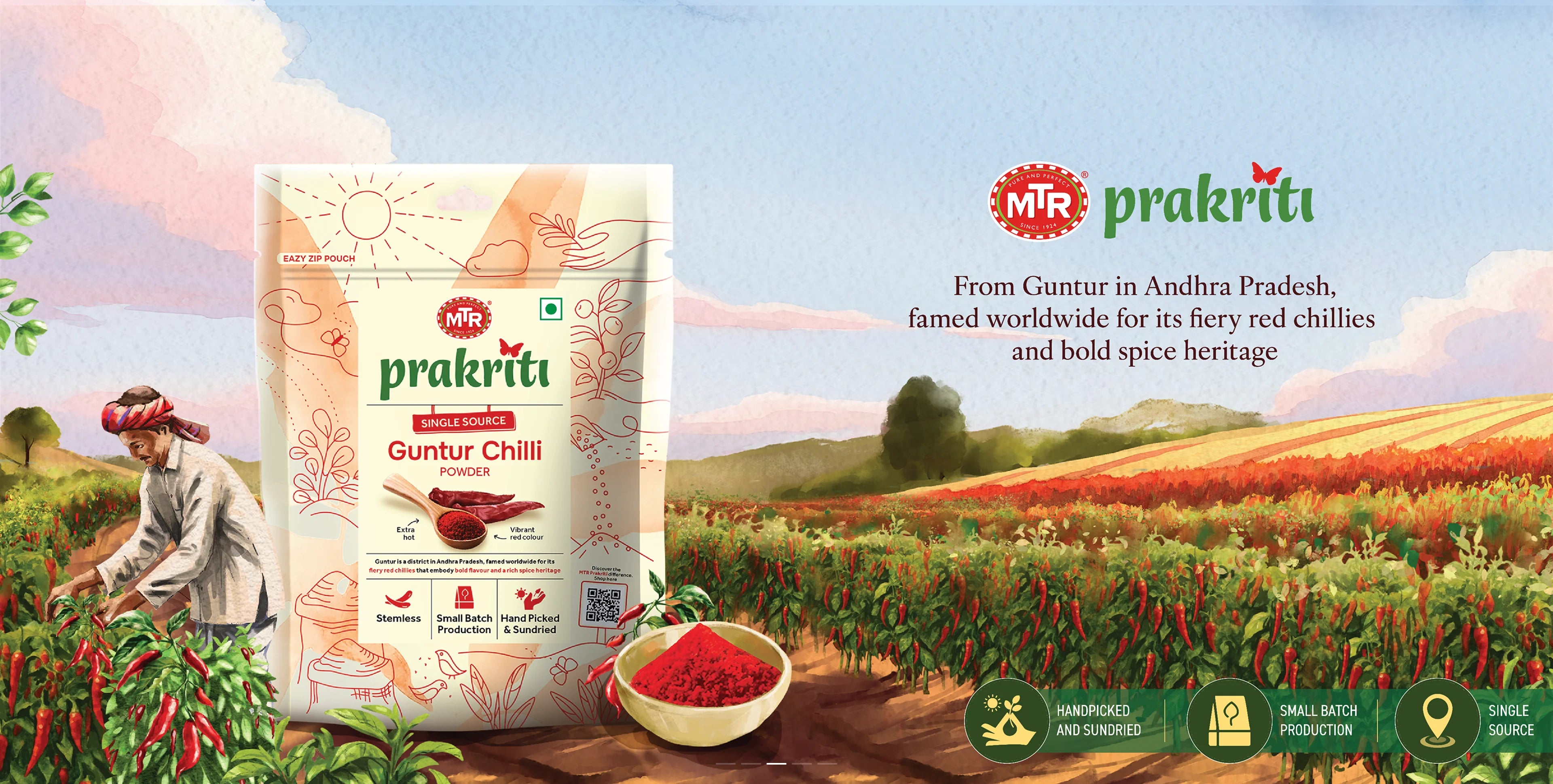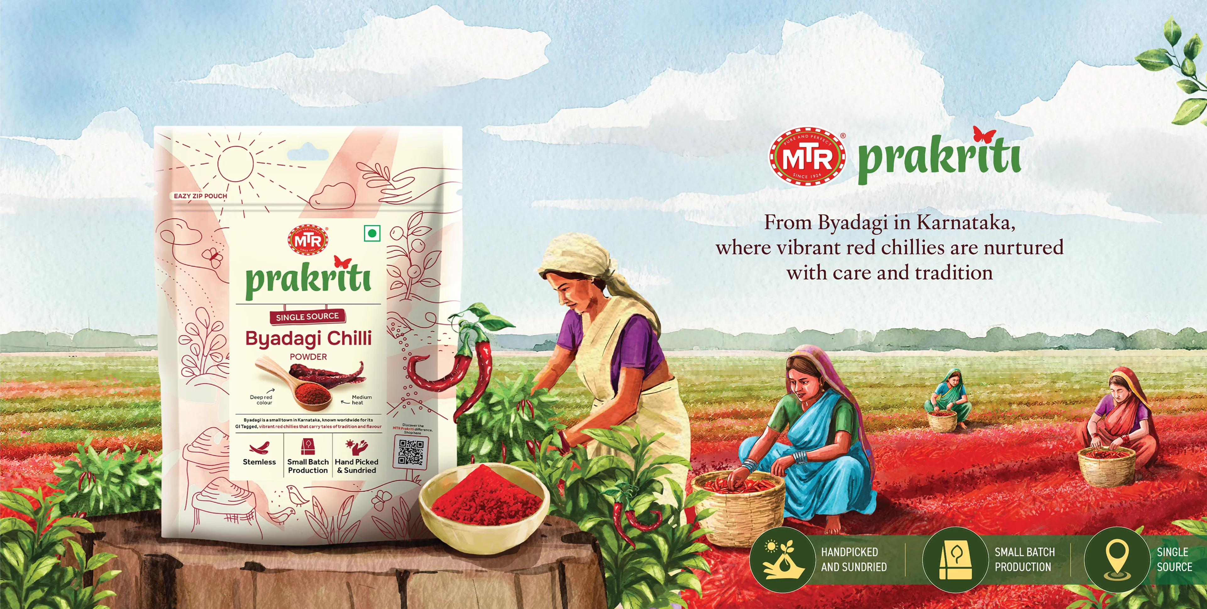 Sourced from the Byadagi region of Karnataka, renowned for its GI-tagged chillies, which are celebrated for their deep, rich red colour and gentle heat. Hand-harvested by women-led farming communities, these chillies are sun-dried naturally and carefully de-stemmed to maintain their natural form. Ground in small, meticulous batches, the chilli powder reflects the vibrant colour and distinctive flavour that Byadagi chillies are renowned for.